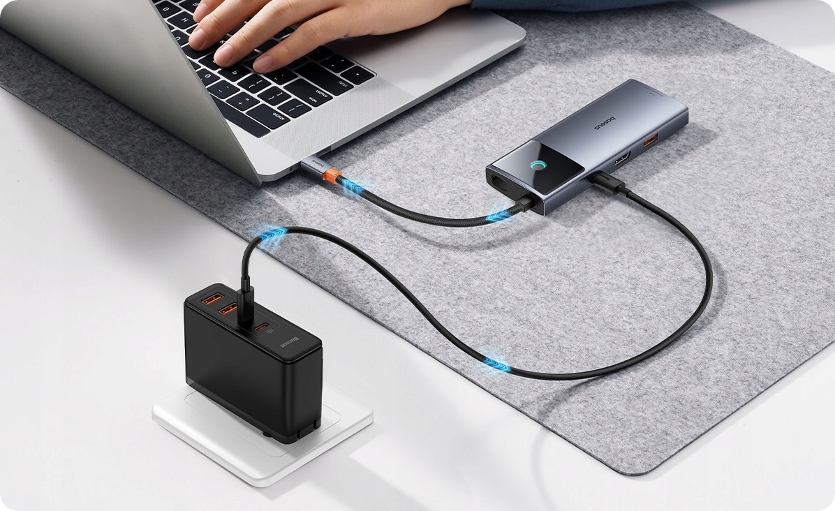 Port USB-C PD (100W): Ten port wspiera ładowanie z mocą do 100W, co umożliwia szybkie i efektywne ładowanie laptopów oraz innych urządzeń zasilanych przez USB-C, nawet podczas korzystania z pozostałych portów HUBa.