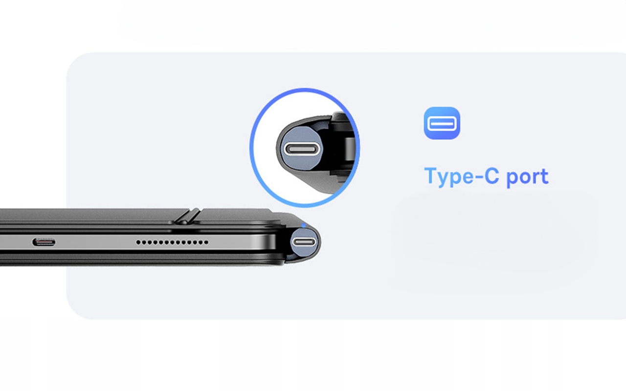 Lid Open, Power On – Lid Close, Auto Rest – po otwarciu klawiatura automatycznie łączy się z iPadem, a po zamknięciu przechodzi w tryb uśpienia, oszczędzając energię. 90-dniowy czas czuwania i wbudowany akumulator 500mAh zapewniają długotrwałe użytkowanie bez konieczności częstego ładowania.