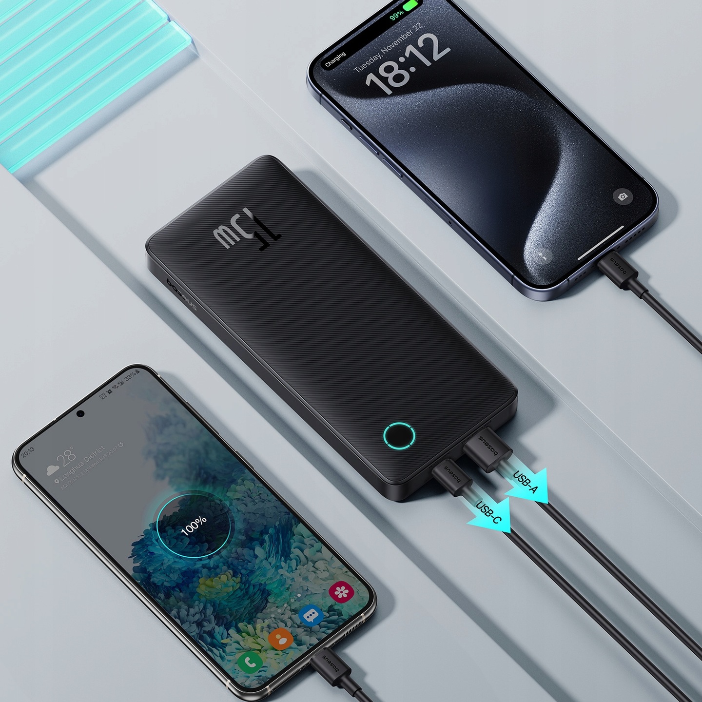 - Dwukierunkowe USB-C – szybkie ładowanie urządzeń i samego powerbanku.