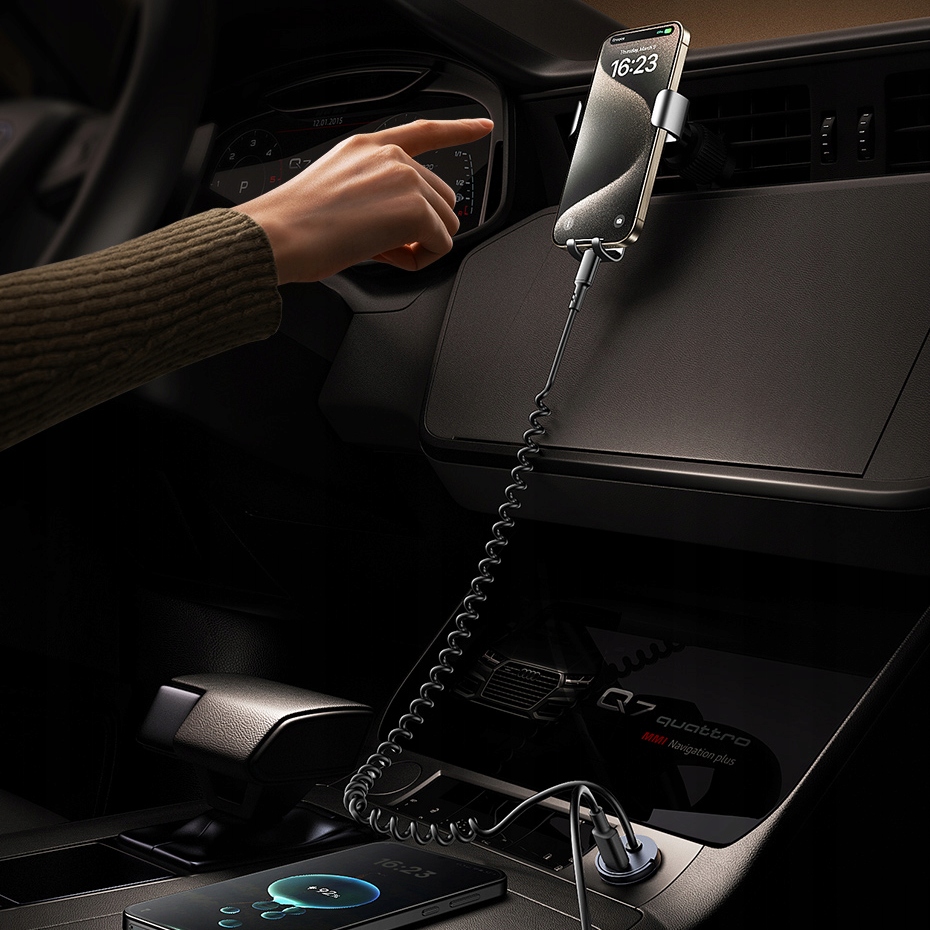 Dzięki wbudowanemu kablowi sprężynowemu o długości 1,4 m oraz dodatkowemu portowi USB-C, możesz ładować dwa urządzenia jednocześnie – zarówno swoje, jak i pasażera. Sprężynowy kabel nie plącze się i automatycznie zwija po odłączeniu.