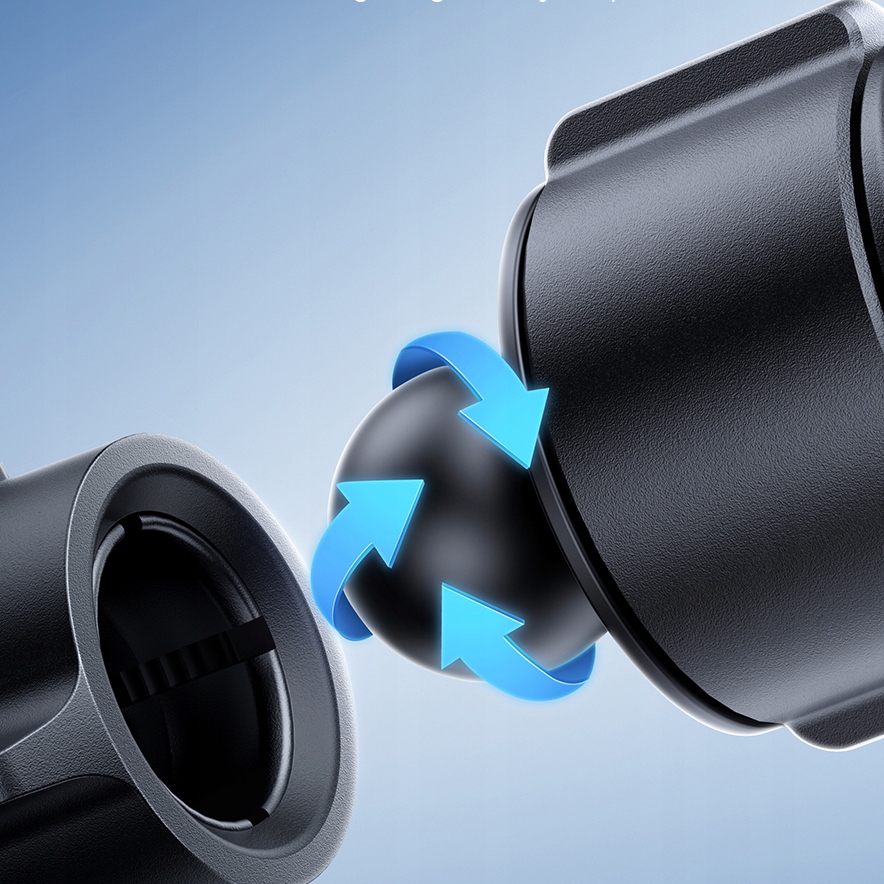 Uchwyt nie zasłania portu ładowania, dzięki czemu można bez przeszkód podłączyć kabel w trakcie jazdy. Kulowy przegub umożliwia pełny obrót o 360°, co pozwala dostosować kąt widzenia ekranu do własnych potrzeb – w pionie, poziomie czy pod kątem.