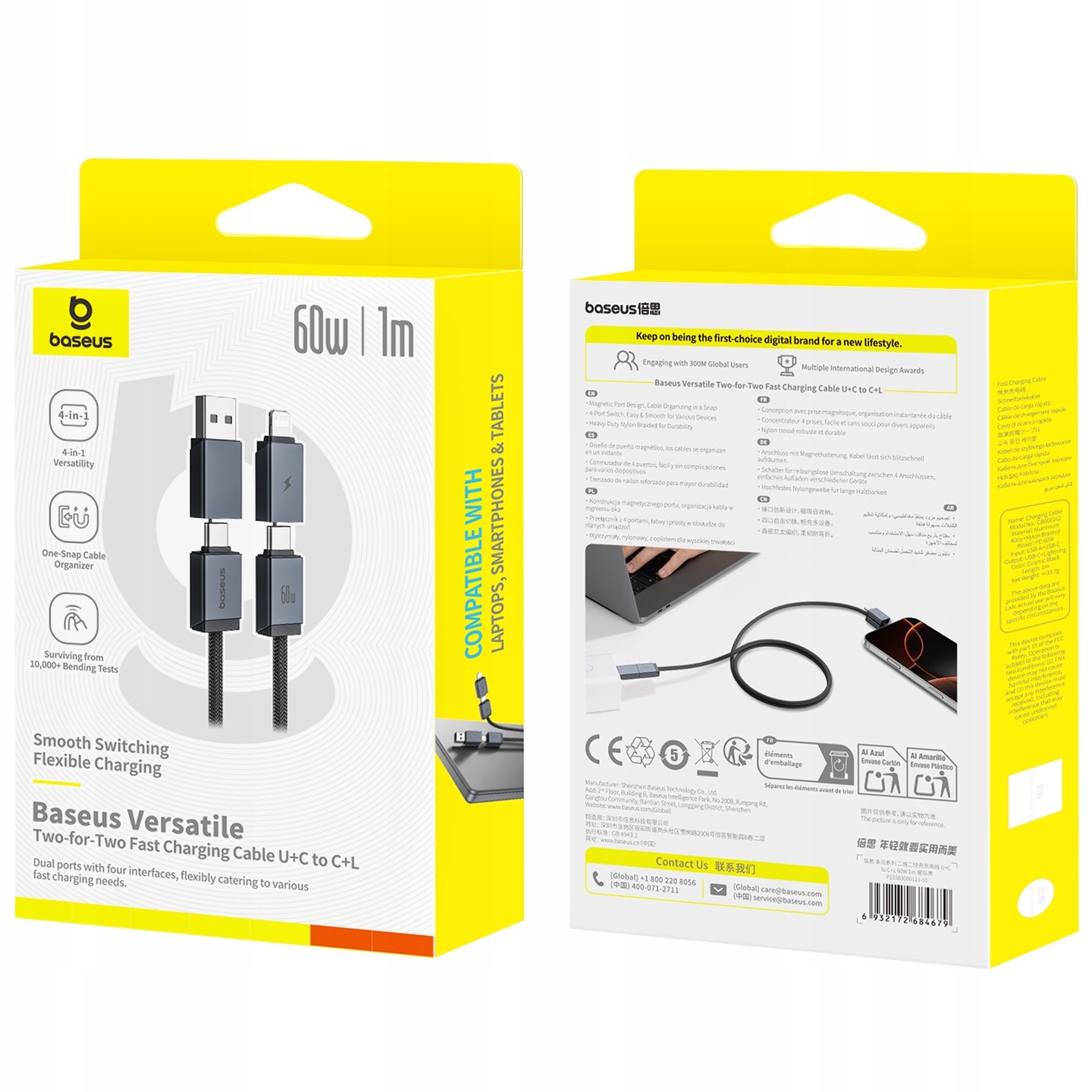 Baseus Versatile Two-for-Two to innowacyjny kabel ładujący 60W, który łączy w sobie aż 4 interfejsy w jednym przewodzie (U+C do C+L). Dzięki temu z łatwością naładujesz różne urządzenia – od smartfonów, przez tablety, aż po laptopy.